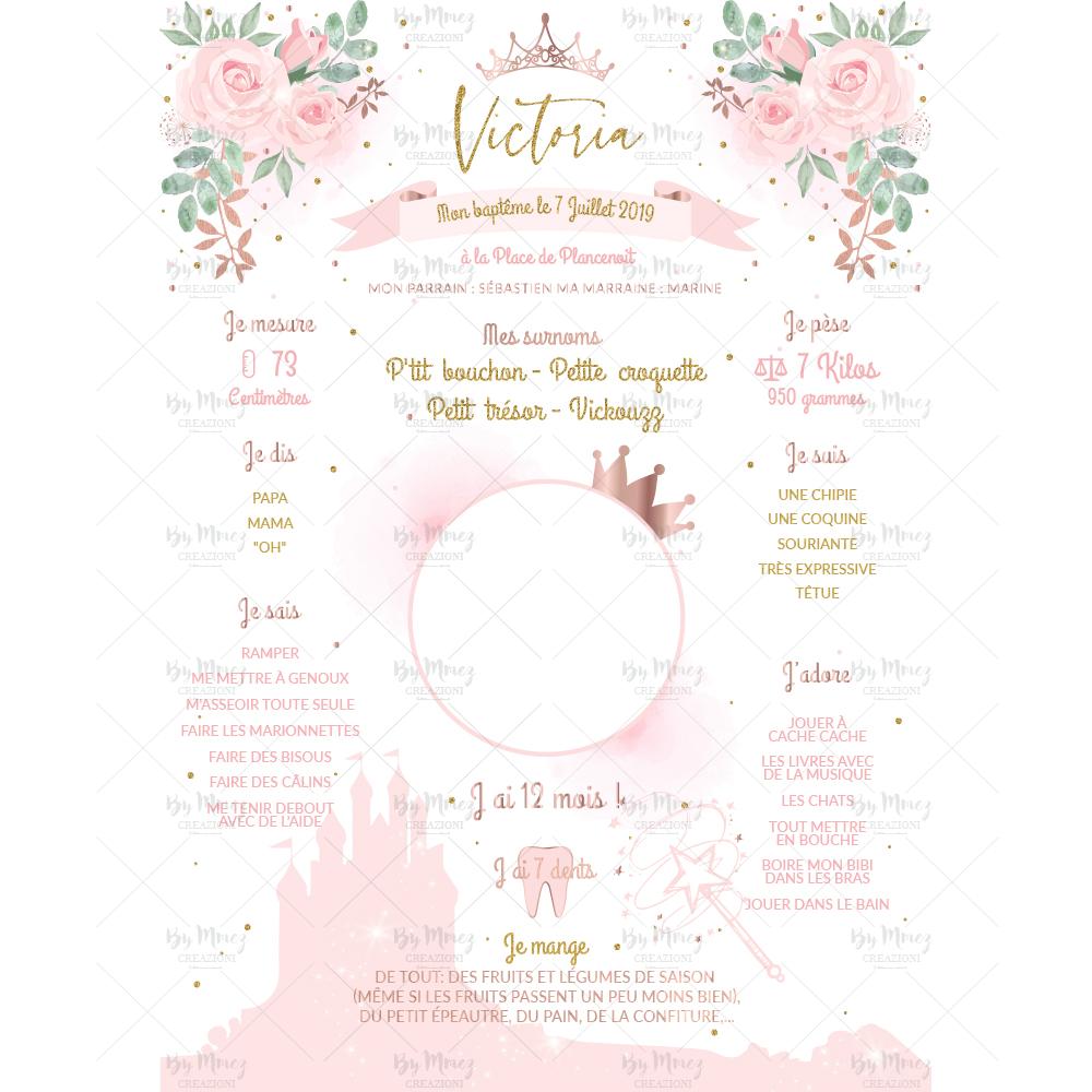 Affiche baptême personnalisée – Thème Princesse et Fleurie
